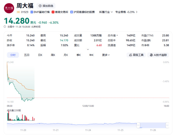 来源:上海证券报/中国证券网上证券报 中国证券报(记者 李子健 周亮)11月26日,周大福低开低走,盘中一度跌幅超过7%。截至10点26分,公司股价已累计下跌6.30%。 11月25日晚,周大福公布截至2025年9月30日的半年度中期财务业绩。公司2026财年上半年营收为389.9亿港元,同比下降1.07%。金额预计为401.9亿港元。今年上半年净利润预计为25.3亿港元,同比增长0.16%至26.3亿港元。毛利率同比下降0.9个百分点至30.5%。仇泰富表示,金价涨幅较小,导致零售产品毛利率下降。然而,固定价格零售和珠宝业务的比例却有所增加相关利润抵消了部分影响。